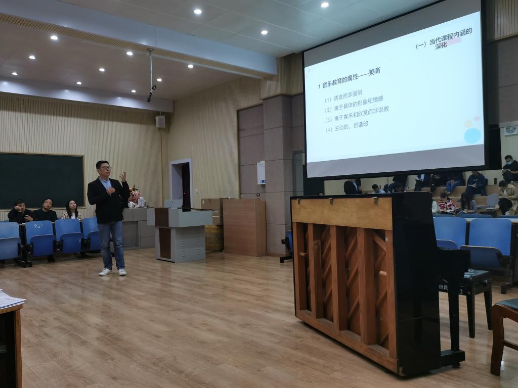 课上,李嘉栋从音乐教师要教给员工什么?员工学什么?等问题出发,以音乐教育的属性、折中主义教育哲学、课程视角的转换、三个系统交集中架构等方面,深度探讨了新旧两种课程标准的精准差异;从用不同课程观的借鉴、核心素养的内涵等方面着重分析了音乐教学的价值取向;从音乐教学的原则、提升审美品质、音乐教学设计框架、理解音乐教材、音乐教学设计的思维逻辑等五个方面诠释了音乐课堂如何进行教学设计;从音乐教学的核心要素、基本框架、教学结构、音乐教学设计的思维逻辑等方面详细的诠释了音乐教学如何设计框架。期间,李嘉栋老师还结合了具体的课堂设计案例进行了示范教学,整场报告既有理论高度又有实际操作,让全体音乐教师对音乐教学有了更深的认识,更新了教学理念,受益匪浅。
