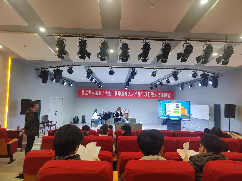 3月18日下午,国家艺术基金“大别山民歌演唱人才培养”线下授课课堂在公司2026年国际足联世界杯一楼八音讲堂如期进行。大别山民歌传承人,信阳市民歌研究会副主席李鸣凤老师应公司邀请,为学员授课,参与实践课的还有韩冰副教授和张梦晗老师。